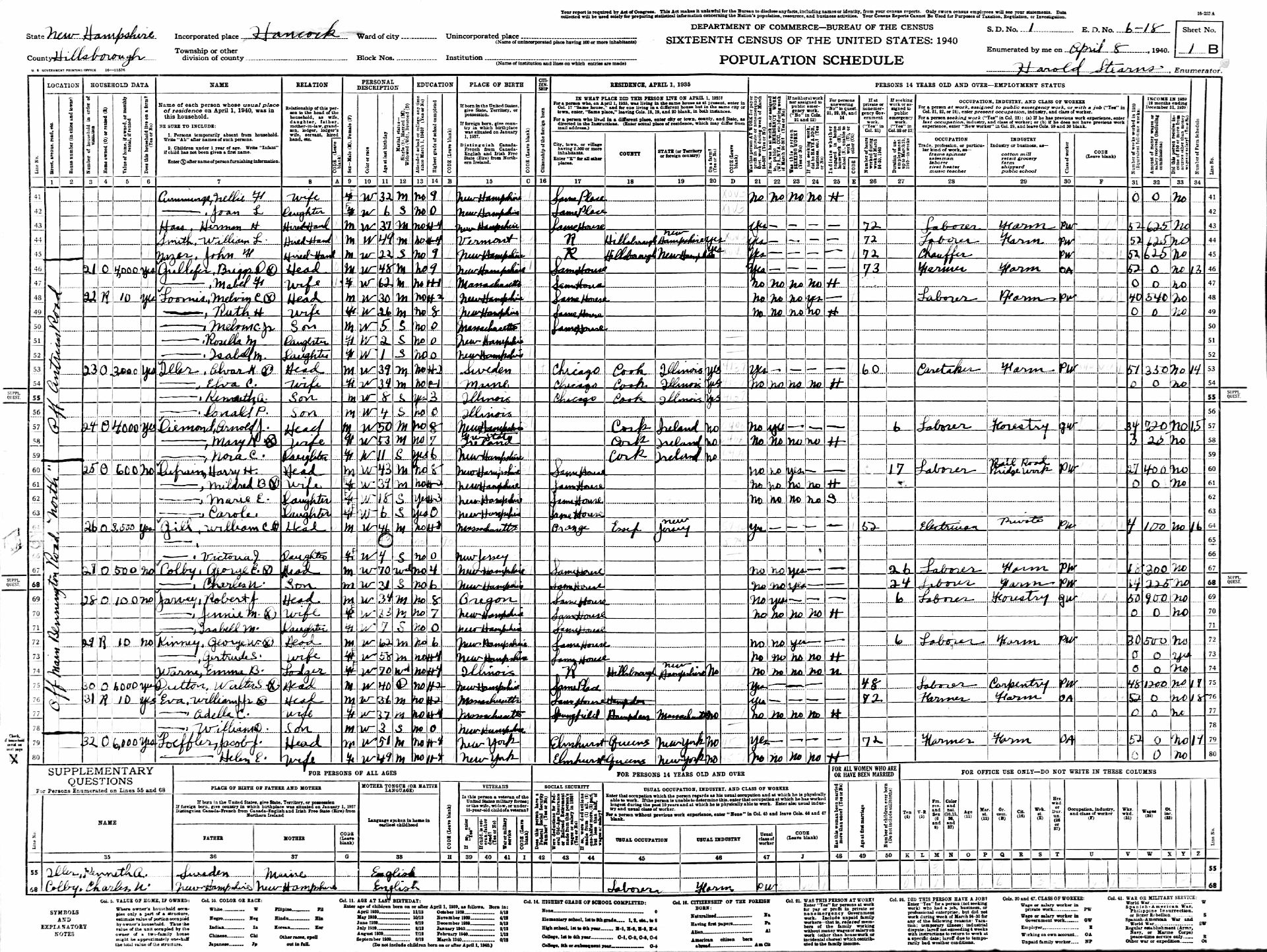 33 | 126 | Dutton | Ezra R | Head | Male | White | 1869 | 51 | Married | New Hampshire | New Hampshire | Massachusetts | | | | | 34 | 126 | Dutton | Nettie R | Wife | Female | White | 1875 | 45 | Married | New Hampshire | New Hampshire | New Hampshire | | | | | 35 | 126 | Dutton | Della A | Daughter | Female | White | 1895 | 25 | Single | New Hampshire | New Hampshire | New Hampshire | | | | | 36 | 126 | Dutton | Walter S | Son | Male | White | 1900 | 20 | Single | New Hampshire | New Hampshire | New Hampshire | | | | | 37 | 126 | Dutton | Chester F | Son | Male | White | 1901 | 19 | Single | New Hampshire | New Hampshire | New Hampshire | | | | |