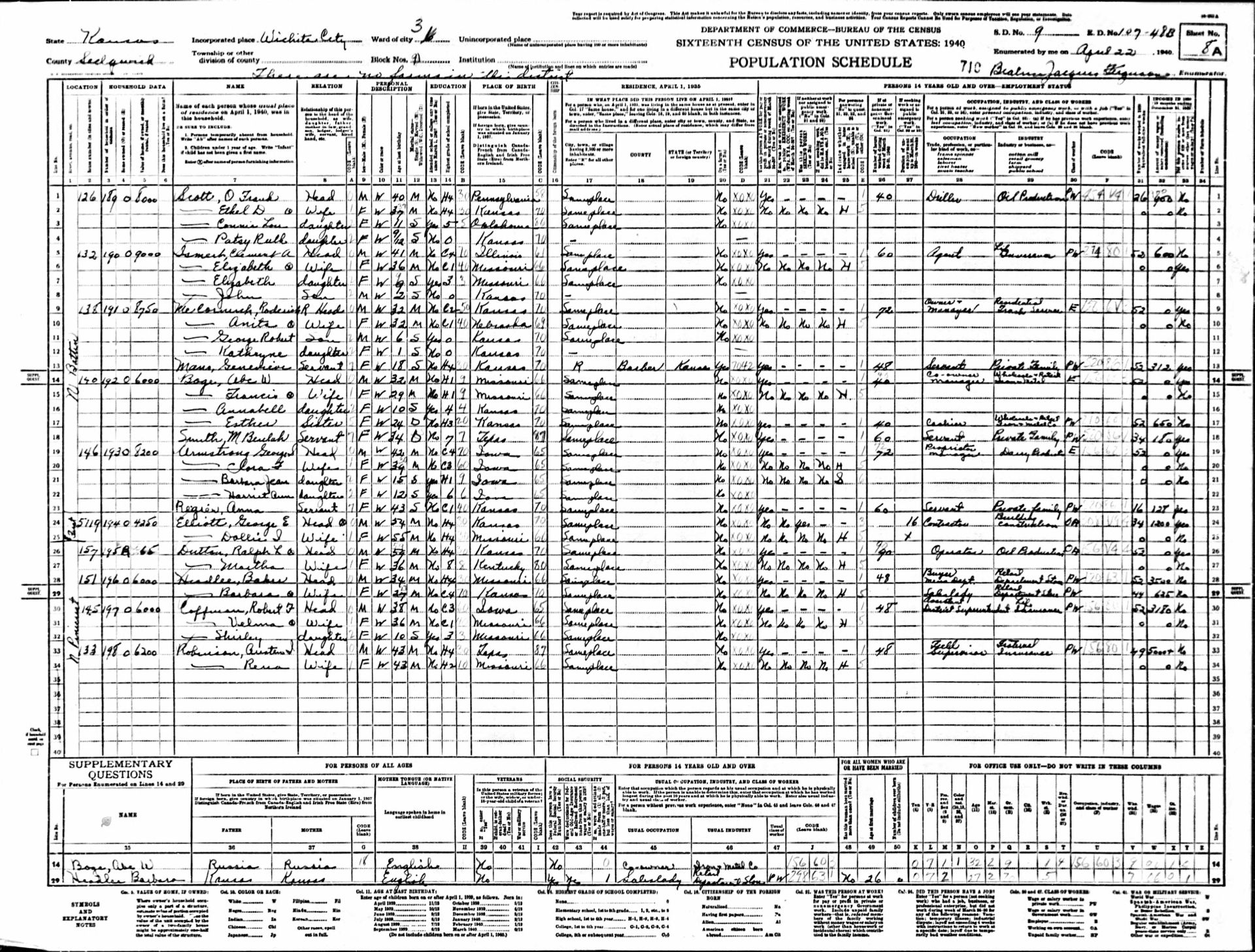 Census | 1940 | Wichita, Sedgwick County, Kansas, USA ![]() |