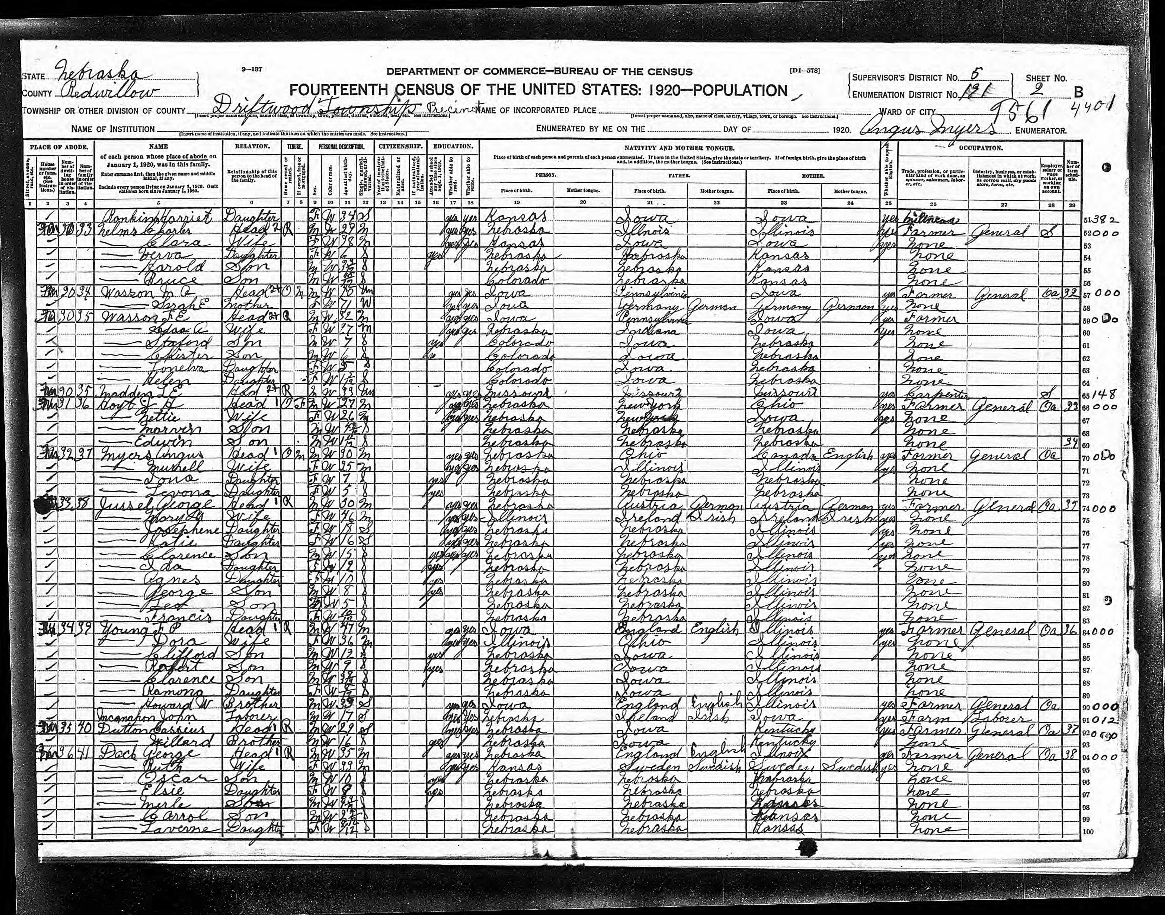 33 | 14 | Dutton Sr | Willard G | Head | Male | White | 1849 | 61 | Married | | | | Iowa | Connecticut | Connecticut | | | 34 | 14 | Dutton | Catherine I | Wife | Female | White | 1859 | 51 | Married | | | | Kentucky | Indiana | Kentucky | | | 35 | 14 | Dutton | Ernest M | Son | Male | White | 1886 | 24 | Single | | | | Nebraska | Iowa | Kentucky | | | 36 | 14 | Dutton | Cassuas M | Son | Male | White | 1891 | 19 | Single | | | | Nebraska | Iowa | Kentucky | | | 37 | 14 | Dutton | Blaine G | Son | Male | White | 1894 | 16 | Single | | | | Nebraska | Iowa | Kentucky | | | 38 | 14 | Dutton Jr | Willard G | Son | Male | White | 1903 | 7 | Single | | | | Nebraska | Iowa | Kentucky | | |