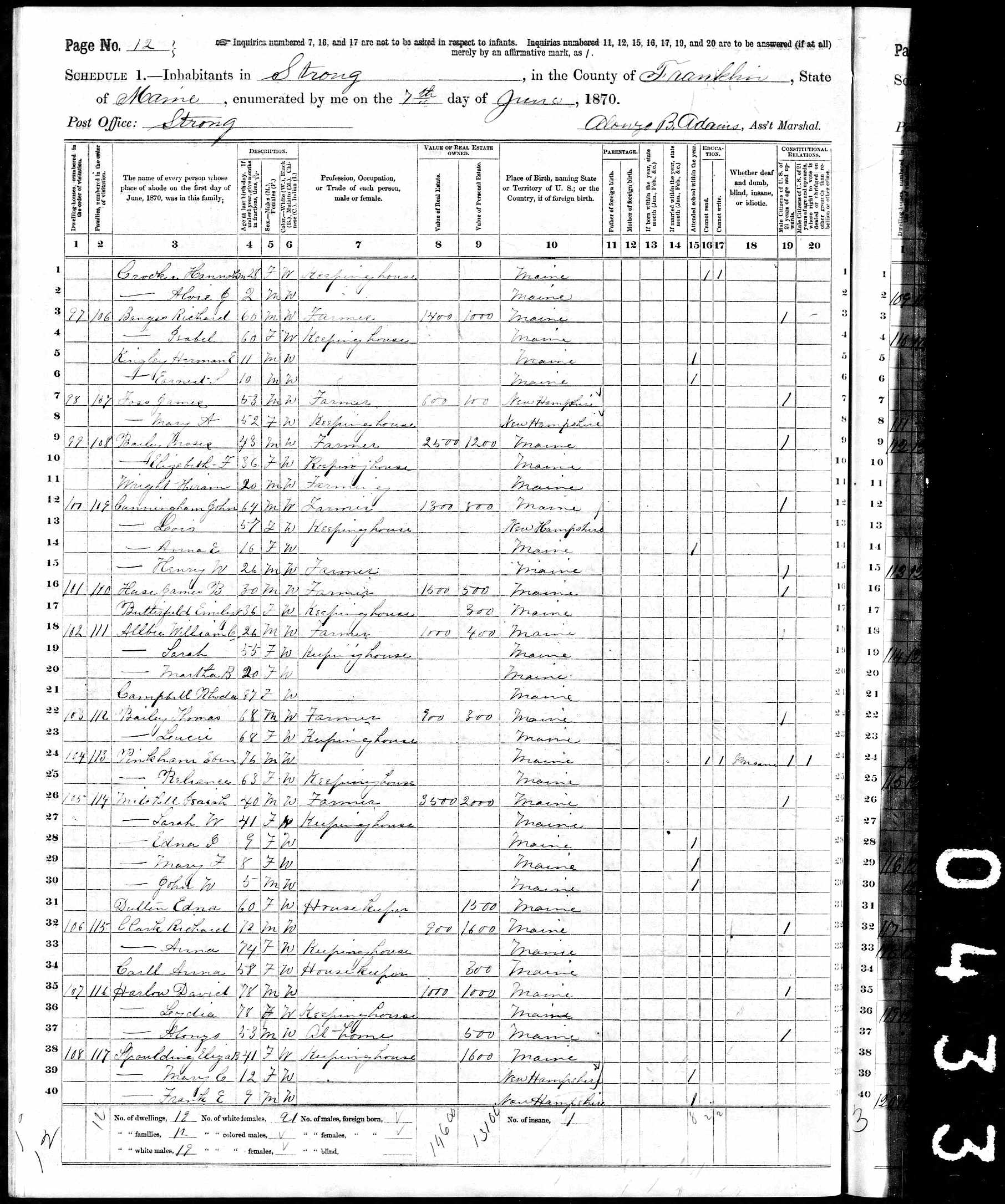 Census | 1870 | Strong, Franklin County, Maine, USA ![]() |
