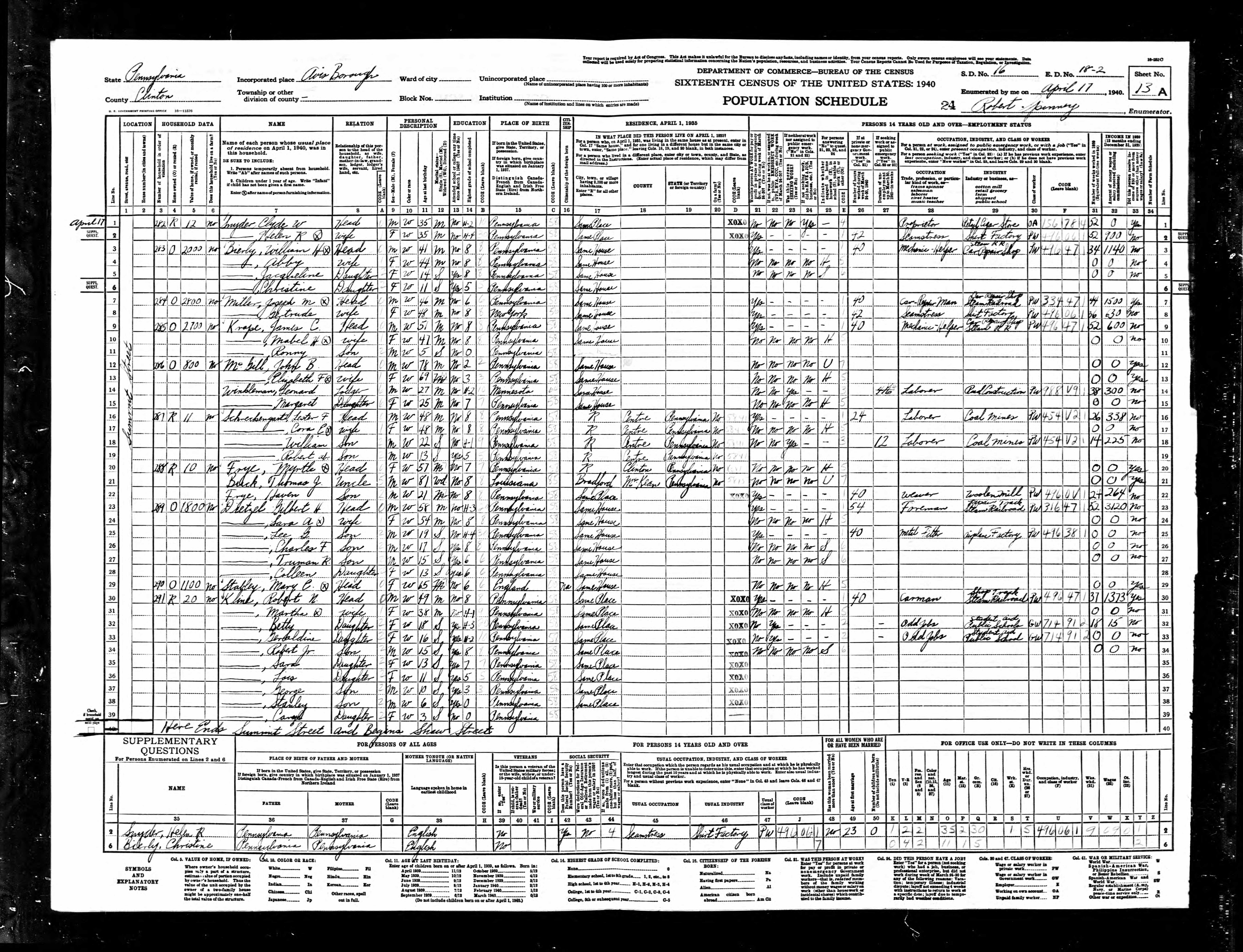 Census | 1920 | Pine Creek, Clinton County, Pennsylvania, USA ![]() |